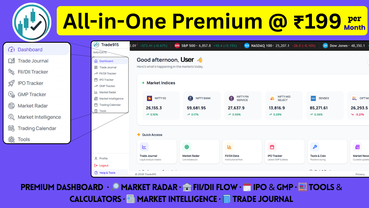 ๐ Unlock the Complete Trade915 Trading Suite โ 30 Days Get full access to all Premium features and trade with clarity, discipline, and data. ๐ Whatโs Included: โ Unlimited Trade Journaling โ Live FII / DII Data โ IPO & GMP Tracker โ Market Radar (Breakouts & Momentum) โ Market Intelligence (Curated News) โ Trading Calendar โ AI-Powered Insights โ Advanced Trading Tools โ Priority Support โก Instant Access After Purchase Start using all premium features immediately โ no waiting. ๐ Trade smarter with Trade915 Premium